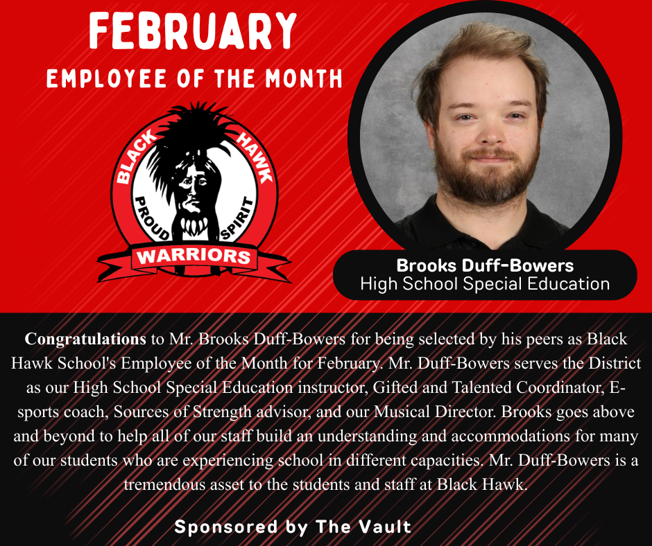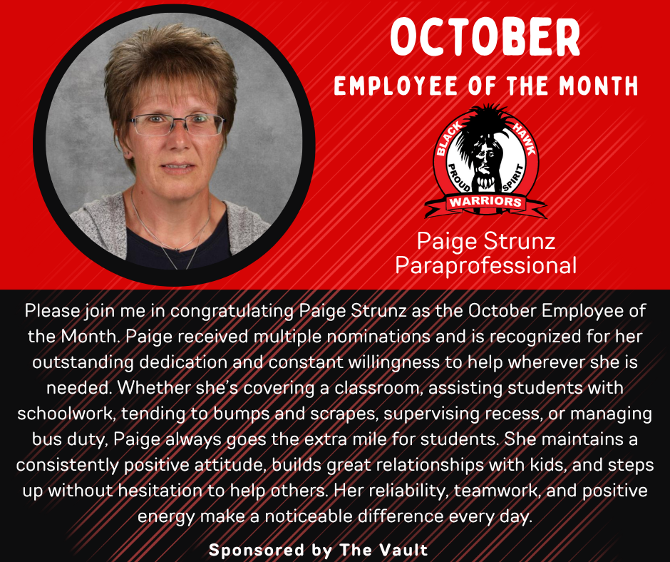 Congratulations to our Employee of the Month for October. Paige Strunz is a Paraprofessional who makes a difference at Black Hawk Schools every day!!