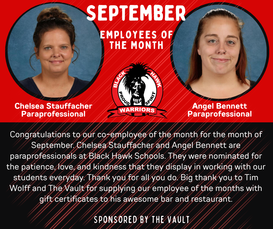 Congratulations to our co-employee of the month for September. Chelsea Stauffacher and Angel Bennett are paraprofessionals at Black Hawk Schools.