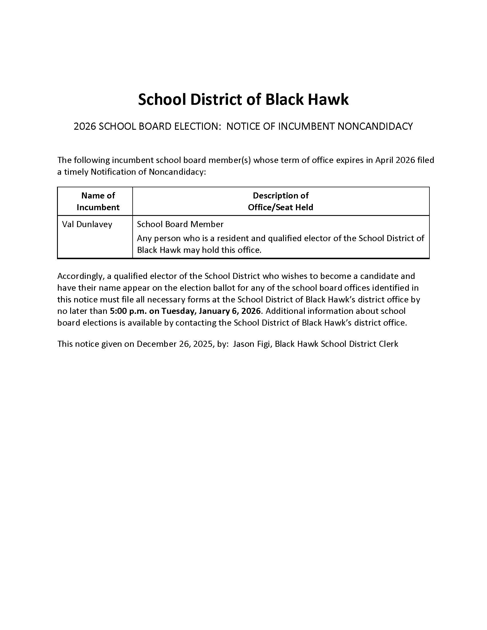 2026 SCHOOL BOARD ELECTION: NOTICE OF INCUMBENT NONCANDIDACY